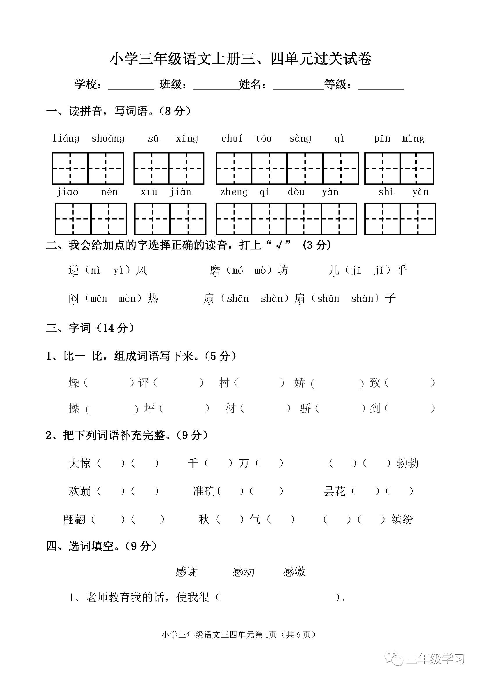 人教版小学三年级语文上册第三、四单元测试题手机版