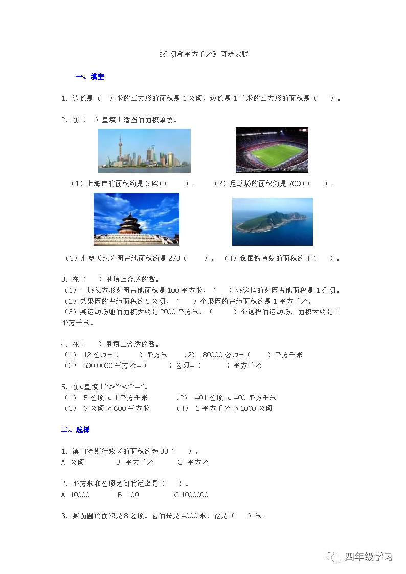 四年级上册数学公顷和平方千米练习题手机版