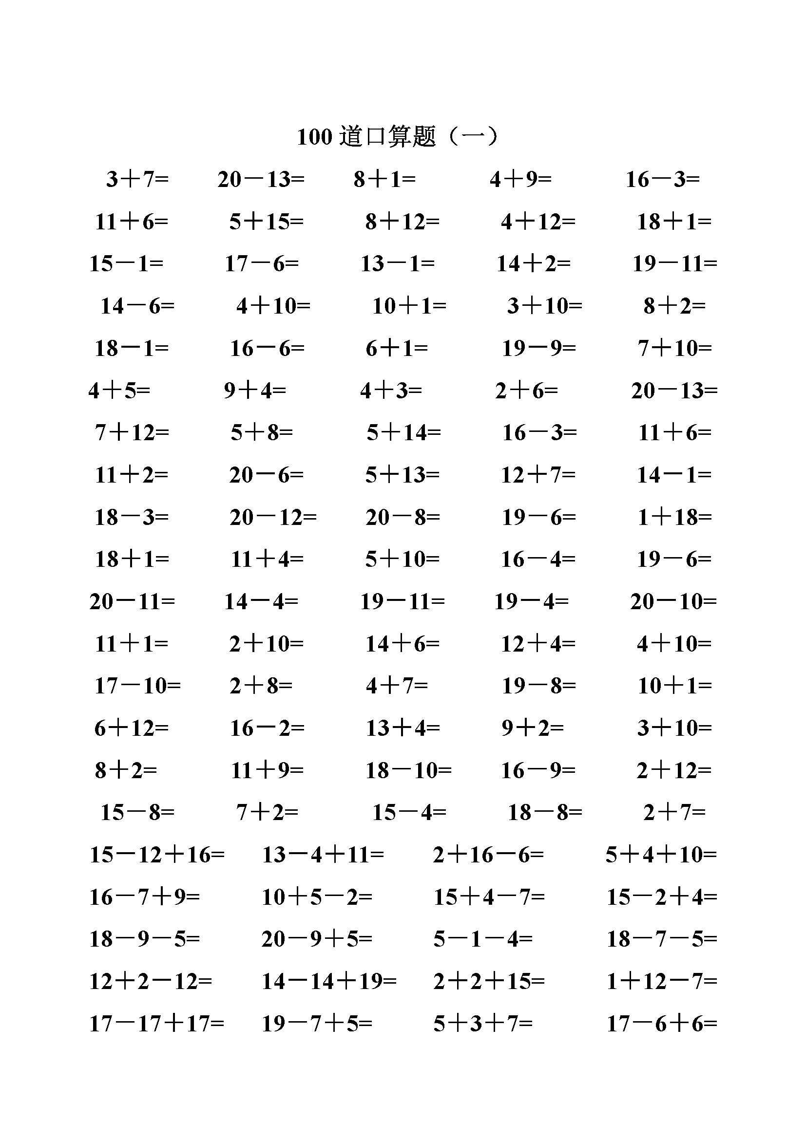 一年级数学20以内加减法口算题(类型齐全)手机版