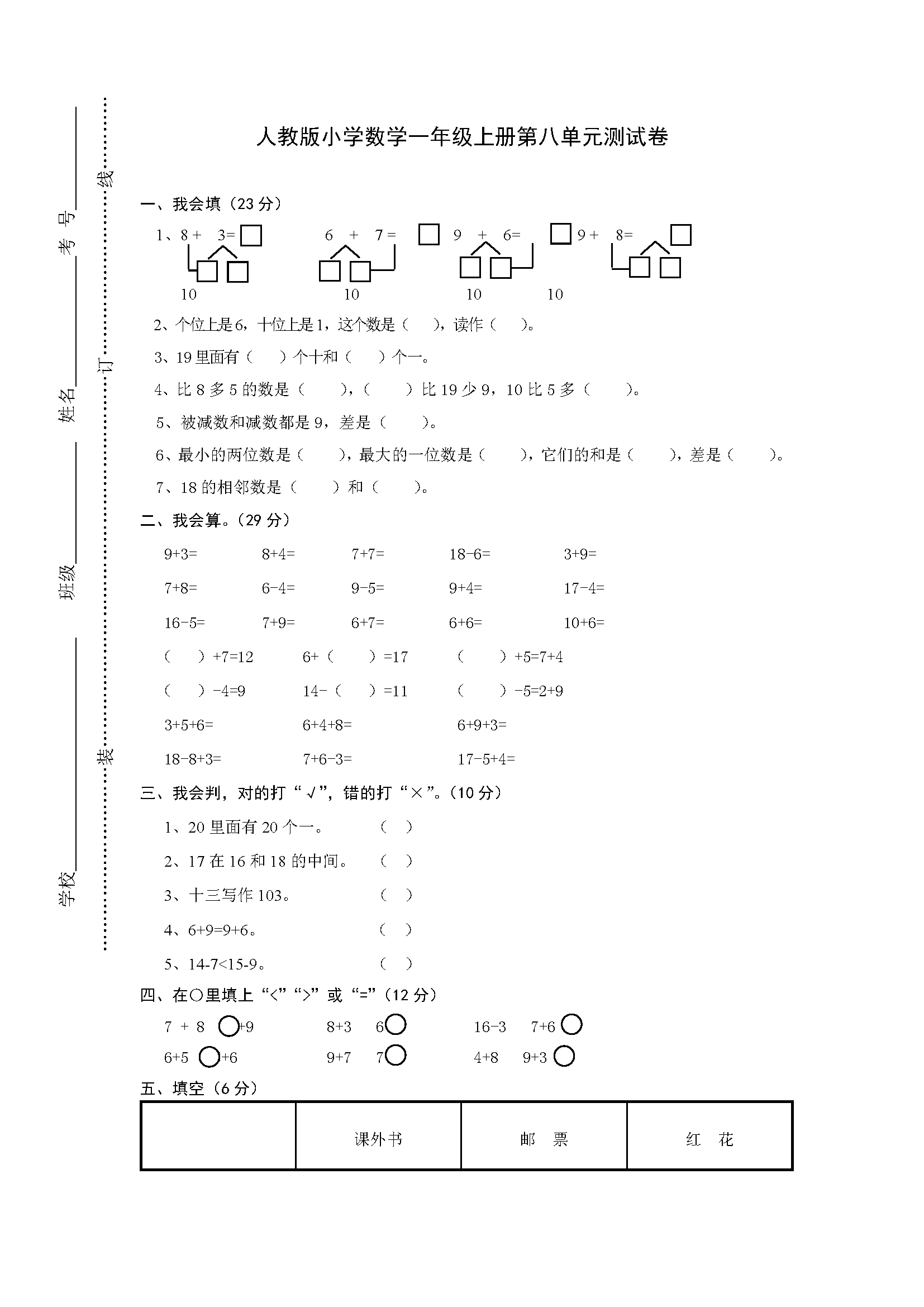 小学一年级上册数学第八单元试卷
