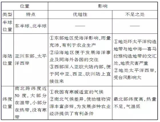 核心提示:1、位置优越 半球位置 :东半球,北半球。 海陆位置 :亚洲东部,太平洋西岸。 纬度位置 :大部分位于中纬度地区,属北温带,南部少数地区位于北回归线以南的热带,没有寒带。 位置优点 2、国土辽阔 陆地面积 :约960万km 2 ,差不多与整个欧洲的面积相等,